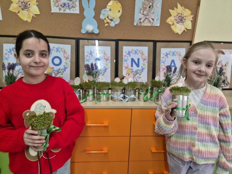 Uczniowie klasy 1C na lekcji edukacji przyrodniczej założyli hodowlę rzeżuchy. Dzieci wykorzystały do tego surowce wtórne, puszki po kukurydzy. Wysiały nasiona na watę. Z dnia na dzień obserwowały wzrost rośliny. Codziennie podlewały i pamiętały o jej nasłonecznieniu. Następnie ozdobiły ją.