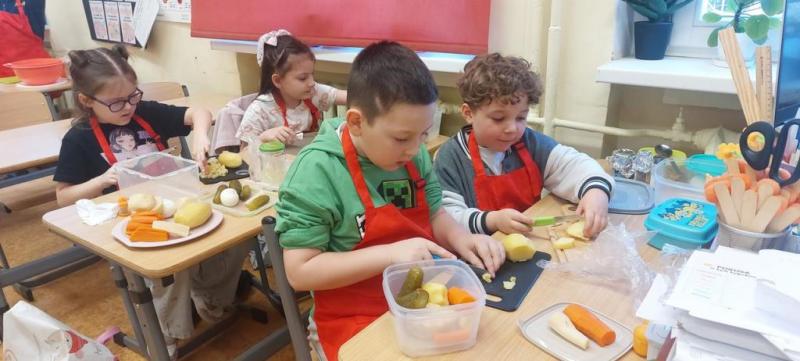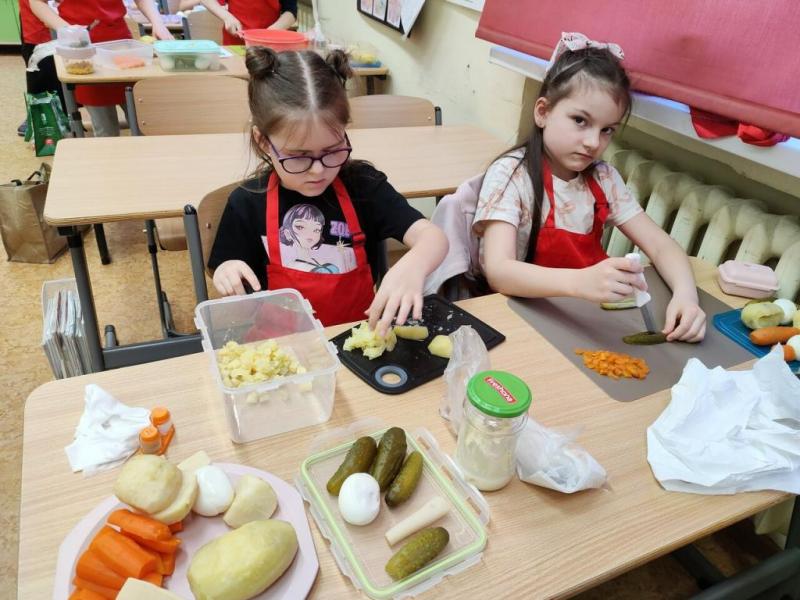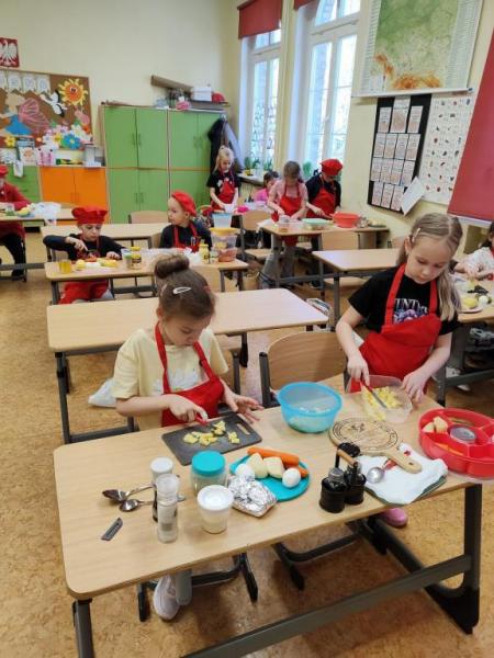 W dniu 27.03.26r. odbyły się kolejne zajęcia kulinarne: „Kuchcikowo, ale zdrowo”. W przedświątecznym klimacie uczniowie klasy 1b przygotowali pyszną sałatkę jarzynową.