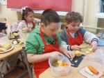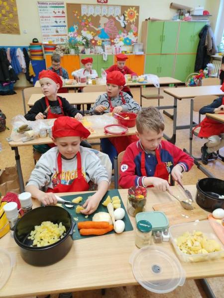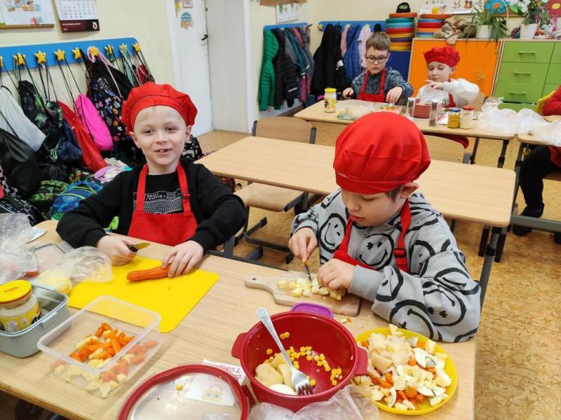 Dzieci z dużym zaangażowaniem kroiły warzywa, mieszały składniki i wspólnie tworzyły tradycyjne danie.